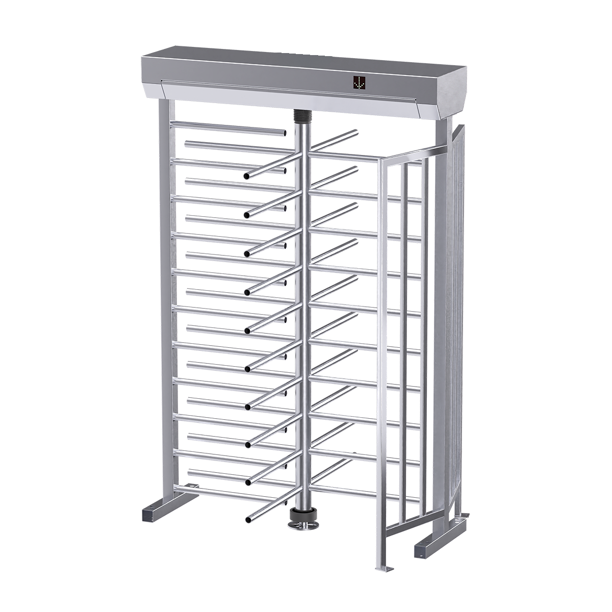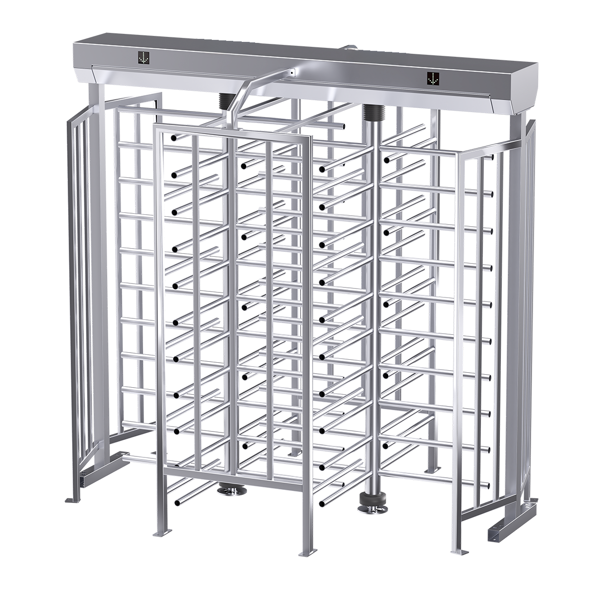 The turnstiles feature a motorized mechanism that supports the rotor movement, ensuring smooth and user-friendly operation. This proven and robust design is ideal for perimeter access control on construction sites (also available as a mobile gate on a platform), industrial facilities, and other locations requiring reliable pedestrian control.